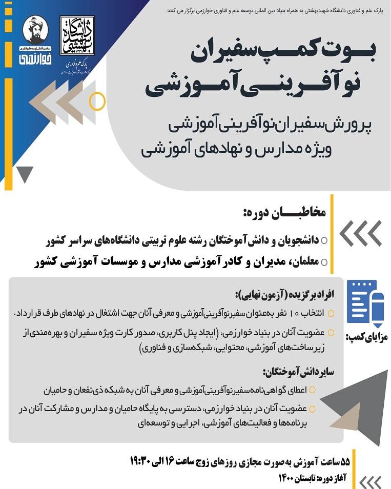 بوت کمپ پرورش سفیران نوآفرینی آموزشی، ویژه دانشجویان و دانش آموختگان رشته علوم تربیتی و تمامی معلمان، مدیران و کادر آموزشی سراسر کشور، با حمایت پارک علم و فناوری دانشگاه شهید بهشتی و بنیاد خوارزمی