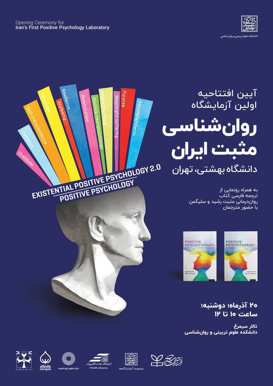 انجمن علمی روانشناسی دانشگاه شهید بهشتی با همکاری مرکز مشاوره پرتو اندیشه، کافه آگاهی، انتشارات رشد، مجموعه آزمایشگاههای دانشکده روانشناسی و علوم تربیتی و آزمایشگاه سلامت الکترونیک دانشگاه شهید بهشتی برگزار میکند: آیین افتتاحیه اولین آزمایشگاه روانشناسی مثبت ایران و رونمایی از ترجمه فارسی کتاب رواندرمانی مثبت رشید و سلیگمن