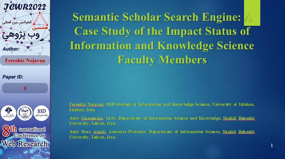 مقاله ای با عنوان موتور جستجوی سمانتیک اسکالر: مطالعه موردی وضعیت اثرگذاری اعضای هیات علمی رشته علم اطلاعات و دانش شناسی در هشتمین کنفرانس بین المللی وب پژوهشی ارائه گردید. این مقاله توسط فرشته نوجوان و امیر قاسمیان از دانش آموختگان رشته علم اطلاعات و دانش شناسی و دکتر اصنافی عضو هیئت علمی این گروه ارائه شد. این همایش روزهای 21 و 22 اردیبهشت 1401 به صورت حضوری و مجازی برگزار گردید.