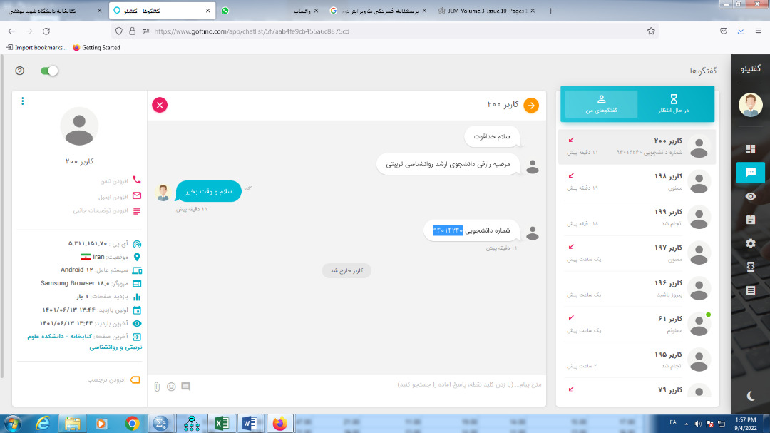 از اردیبهشت 1401 سامانه آنلاین گفتگو با کتابدار در کتابخانه دانشکده علوم تربیتی و روانشناسی راه اندازی شد. کاربران، استقبال زیادی از این سامانه داشتند و روزانه تعامل های زیادی با کتابداران برای دریافت اطلاعات علمی برقرار میشد. روز گذشته، میزان کاربران این سامانه به 206 نفر رسید. پرسش های سریع مرجع، ارسال مقالات، نحوه یافتن پایان نامه ها، سوالات تخصصی در زمینه گردآوری منابع اطلاعاتی و استناددهی از جمله مواردی است که در این سامانه از کتابداران کتابخانه دانشکده پرسیده شده است.