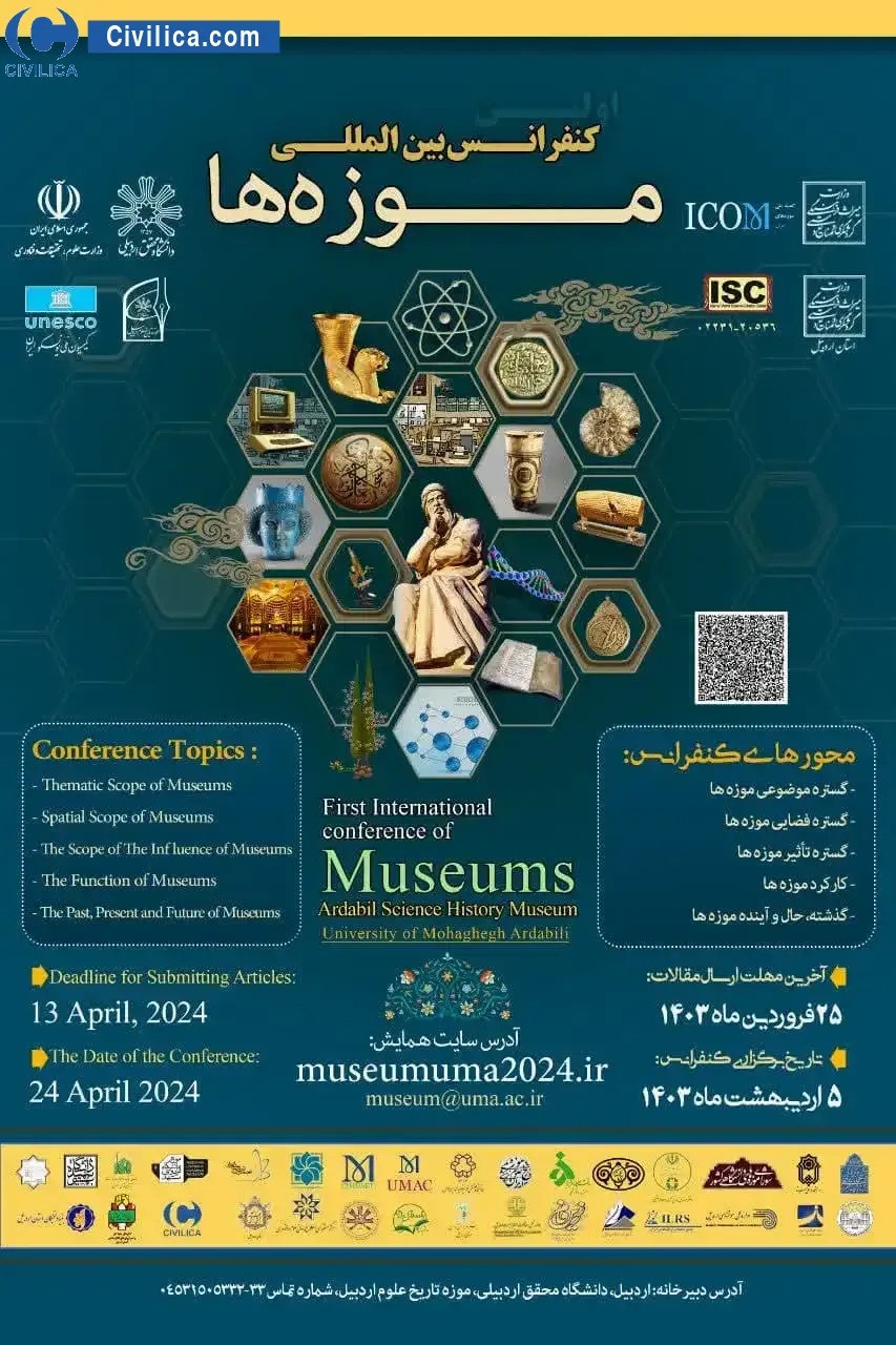اولین کنفرانس بین المللی موزه ها در تاریخ ۵ اردیبهشت ۱۴۰۳ توسط دانشگاه محقق اردبیلی، در شهر اردبیل برگزار خواهد شد.با توجه به اینکه این همایش به صورت رسمی برگزار می گردد، کلیه مقالات این کنفرانس در پایگاه سیویلیکا و نیز کنسرسیوم محتوای ملی نمایه خواهد شد. جزئیات بیشتر در وب سایت همایش قابل دسترس است. https://museumuma1402.ir/fa/?id=69&p=67
