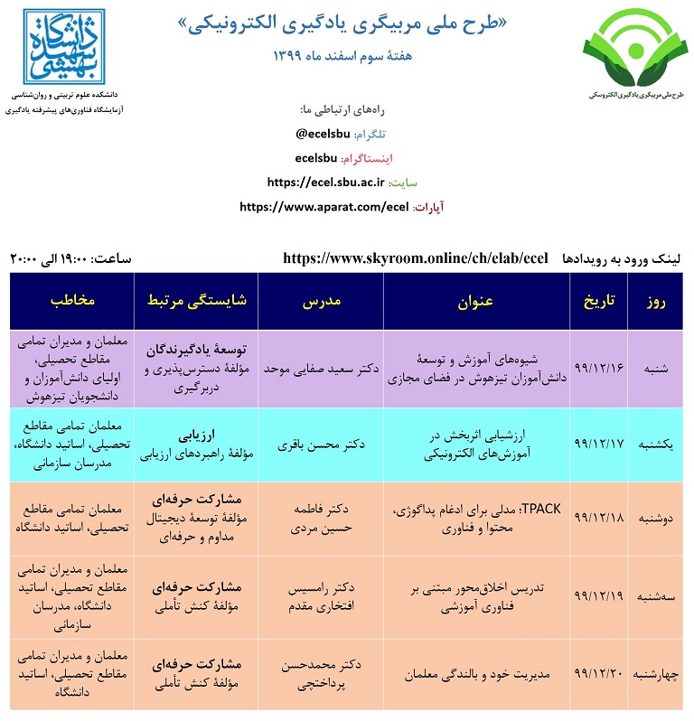 طرح ملی «مربیگری یادگیری الکترونیکی» با هدف توانمندسازی معلمان، مدیران و کادر آموزشی مدارس توسط آزمایشگاه «فناوریهای پیشرفته یادگیری» دانشکده علوم تربیتی و روانشناسی در حال اجرا می باشد. وبینارهای آموزشی برنامه ریزی شده در این طرح برای هفته سوم اسفند ماه به شرح پوستر ذیل قابل مشاهده است. علاقهمندان میتوانند برای شرکت در وبینارها به پلتفرم اسکایروم به آدرس زیر مراجعه کنند: