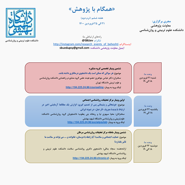 برنامه وبینارهای هفته ششم (ترم دوم) از رویدادهای معاونت پژوهشی دانشکده علوم تربیتی و روانشناسی
