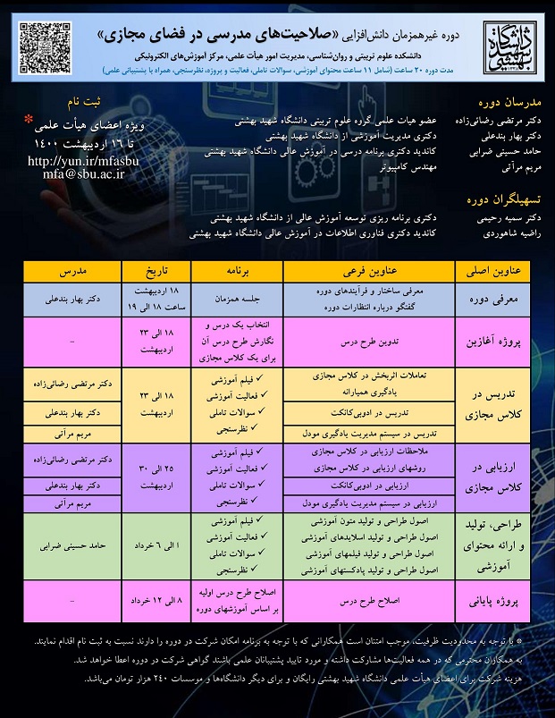 لازم به ذکر است که ظرفیت این دوره در همان ساعات ابتدائی ثبت نام، تکمیل شد. اساتید علاقهمند که موفق به ثبت نام نشدند، امکان حضور در دورههای مشابه ترمهای آتی را خواهند داشت.