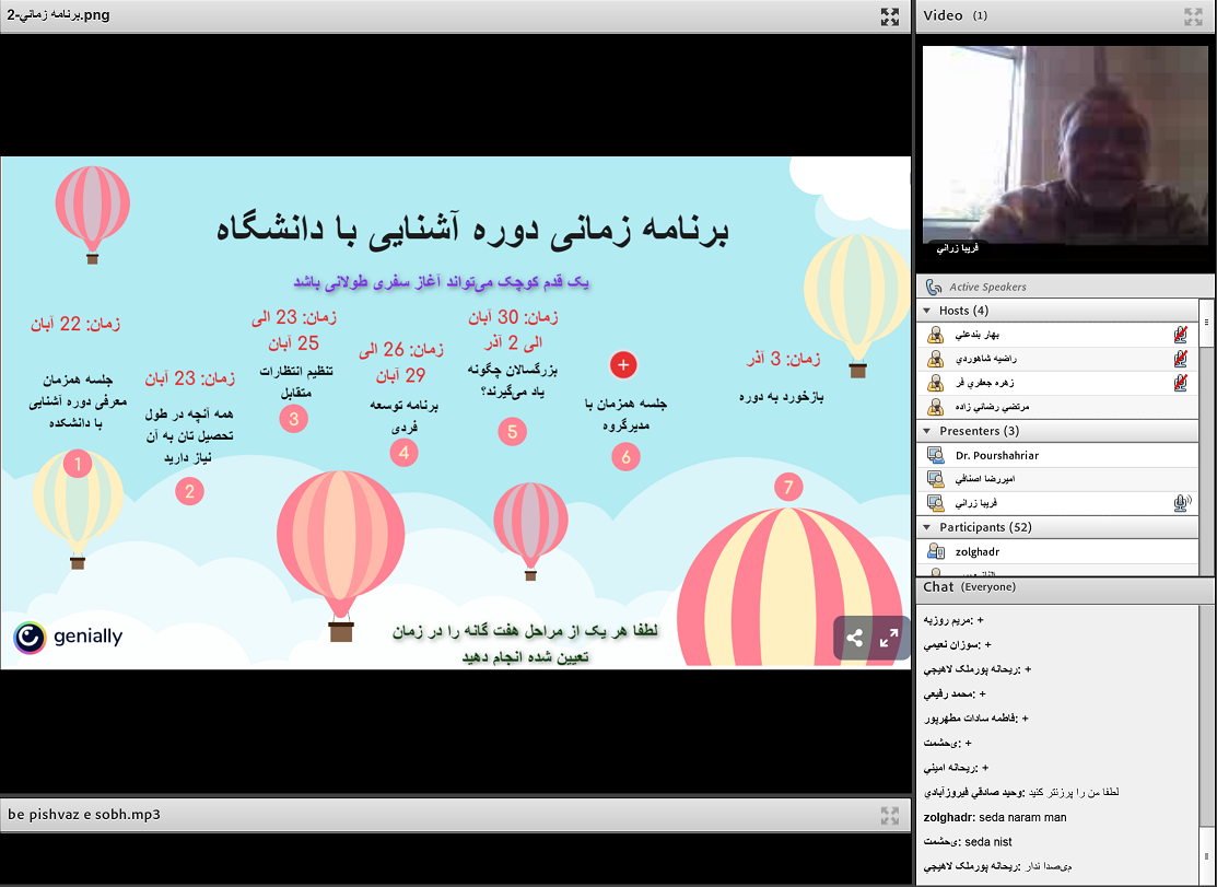 اولین بخش دوره «یادگیریِ چگونه یادگرفتن»، جلسه مجازی «معارفه شورای دانشکده علوم تربیتی و روانشناسی و دانشجویان جدیدالورود» بود که روز شنبه مورخ 22 آبان 1400 با حضور دکتر محمدعلی مظاهری تهرانی -رئیس دانشکده-، دکتر فریبا زرانی و دکتر محسن دهقانی -معاونان آموزشی و پژوهشی-، دکتر محمود ابوالقاسمی، دکتر محمود حیدری، دکتر حسین پورشهریار کلشتری و دکتر امیررضا اصنافی -به ترتیب مدیران گروههای علمی علوم تربیتی، روانشناسی، مشاوره و علم اطلاعات و دانششناسی-، دکتر فرنوش اعلامی و دکتر وحید صادقی فیروزآبادی -رئیس مرکز نوآوری و رئیس مجموعه آزمایشگاهها-، دکتر مرتضی رضایی زاده -عضو هیئت علمی گروه علوم تربیتی- و همچنین جمعی از دانشجویان جدیدالورود مقطع کارشناسی ارشد برگزار شد.