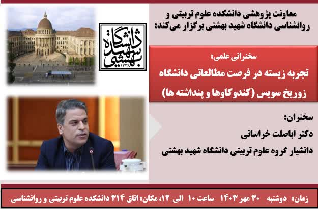 معاونت پژوهشی دانشکده علوم تربیتی و روانشناسی دانشگاه شهید بهشتی برگزار می کند. سخنرانی علمی، تجربه زیسته در فرصت مطالعاتی دانشگاه زوریخ سویس (کندوکاوها و پنداشته ها) توسط دکتر اباصلت خراسانی، دانشیار گروه علوم تربیتی دانشگاه شهید بهشتی، دوشنبه 30 مهر 1403 از ساعت 10-12 در اتاق 314 برگزار می شود. از تمامی دانشجویان و اعضای هیات علمی برای شرکت در این جلسه دعوت به عمل می آید.