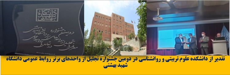 یکشنبه اول خرداد 1401 جشنواره روابط عمومی های برتر دانشگاه شهید بهشتی در سالن خوارزمی مرکز همایشهای دانشگاه برگزار شد. در این جشنواره از مراکز، دانشکده ها و پژوهشکده های برتر در حوزه روابط عمومی تقدیر شد. دانشکده علوم تربیتی و روانشناسی جزو واحدهای برتر در همه شاخصها شناخته شد و با حضور دکتر مظاهری رئیس دانشکده، تقدیر شد.