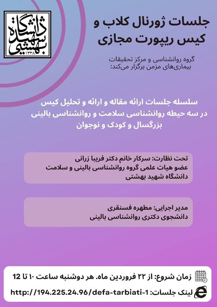 گروه روانشناسی و مرکز تحقیقات بیماری های مزمن، سلسله جلسات ارائه مقاله و ارائه و تحلیل کیس در سه حیطه روانشناسی سلامت، روانشناسی بالاینی، بزرگسال و کودج و نوجوان را تحت نظارت دکتر زرانی برگزار می کند. برای اطلاعات بیشتر به پوستر زیر مراجعه شود.
