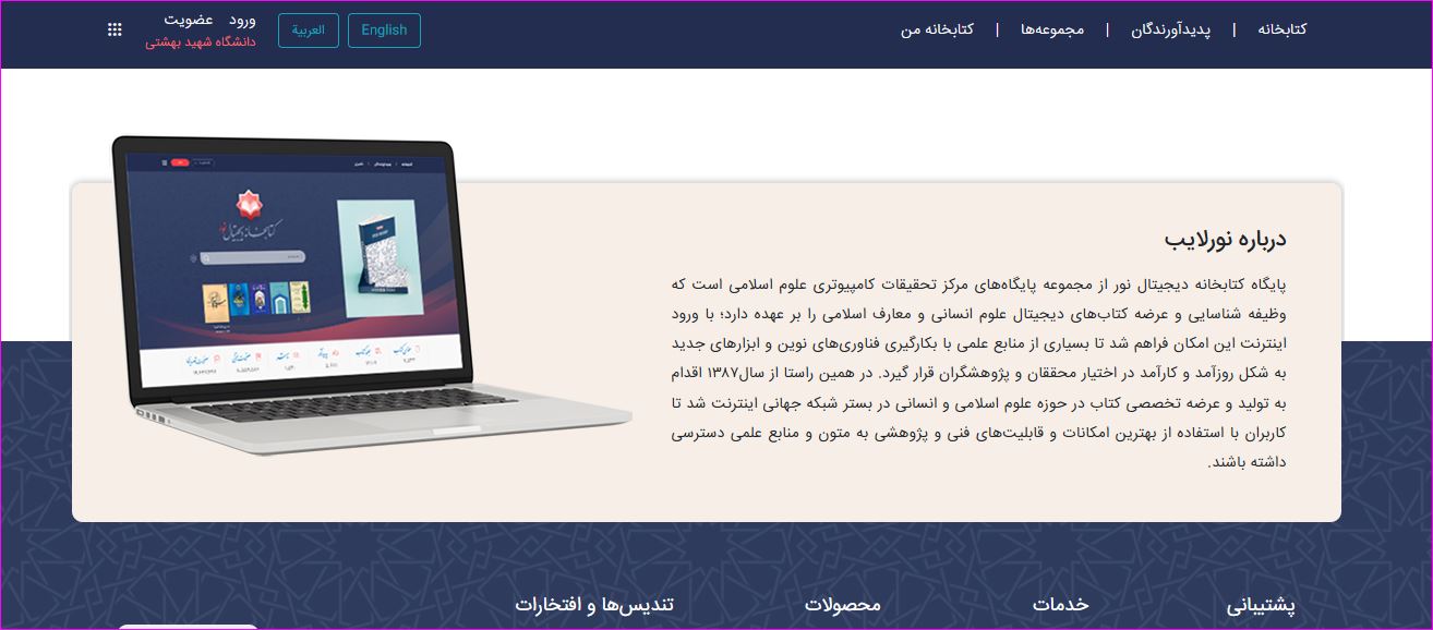 به اطلاع پژوهشگران دانشکده می رساند که دسترسی به پایگاه کتب فارسی نورلایب در دانشگاه شهید بهشتی فراهم شده است. لطفاً به نشانی زیر