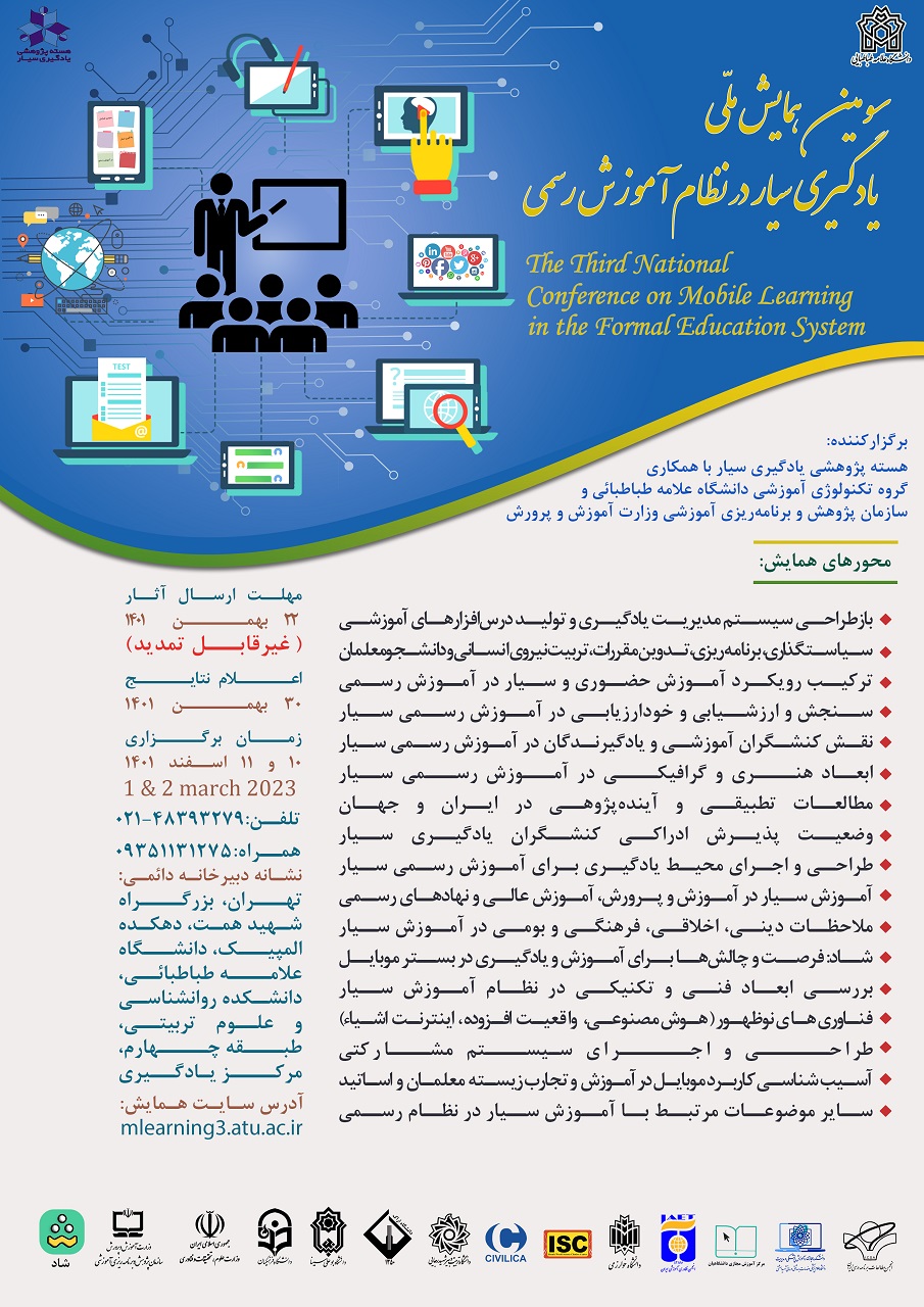سومین همایش با عنوان یادگیری سیار در نظام آموزش رسمی از سوی هسته پژوهشی یادگیری سیار و گروه تکنولوژی آموزشی دانشگاه علامه طباطبایی برگزار می گردد. صاحبنظران و خبرگان خصوصا اساتید، دانشجویان و معلمین که در حوزه آموزش مشغول خدمت هستند، مقالات خود را براساس زمانبندی اعلام شده در سایت حداکثر تا 12 بهمن 1401 به دبیرخانه ارسال نمایند. جزئیات بیشتر در پیوند زیر قابل مشاهده است.