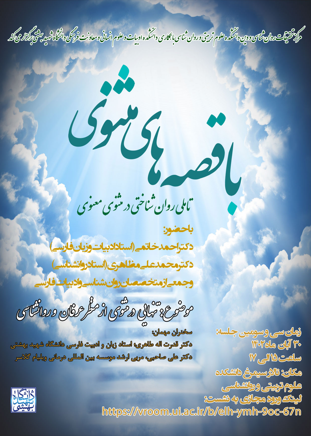 سی آبان سی وسومین جلسه با قصه های مثتوی برگزار می شود. این جلسه در تالار سیمرغ از ساعت 15 آغاز می شود.برای اطلاعات بیشتر پوستر زیر را مطالعه نمائید.