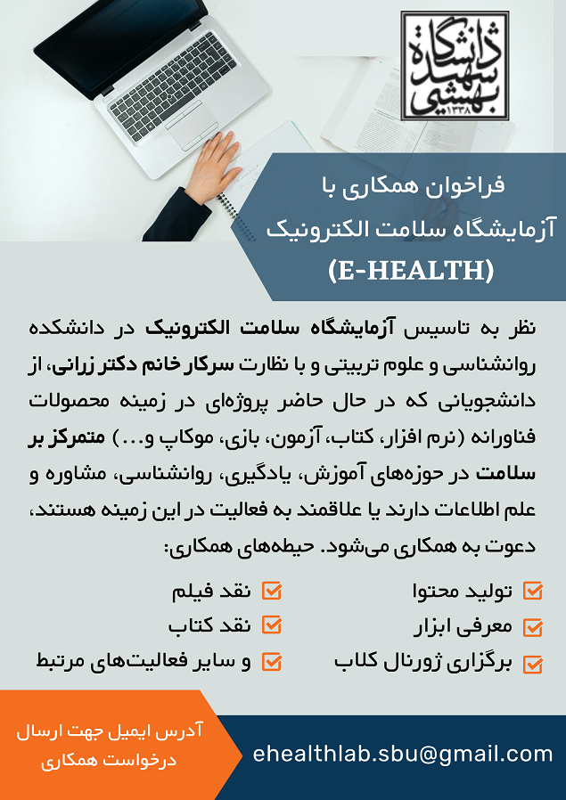 نظر به تاسیس آزمایشگاه سلامت الکترونیک در مجموعه آزمایشگاههای دانشکده روانشناسی و علوم تربیتی و با نظارت سرکار خانم دکتر زرانی، از دانشجویانی که در حال حاضر پروژهای در زمینه محصولات فناورانه (نرم افزار، کتاب، آزمون، بازی، موکاپ و...) متمرکز بر سلامت در حوزههای آموزش، یادگیری، روانشناسی، مشاوره و علم اطلاعات دارند یا علاقمند به فعالیت در این زمینه هستند، دعوت به همکاری میشود. حیطههای همکاری: