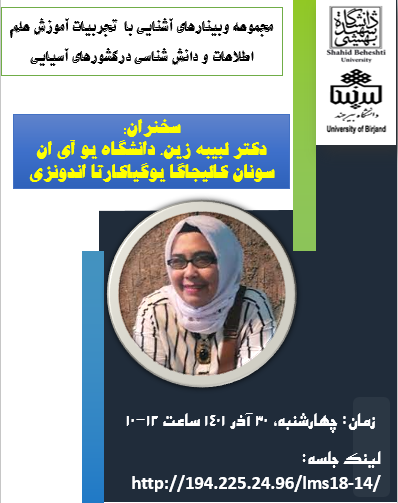 چهارشنبه، 30 آذر 1401 وبیناری دیگر از مجموعه وبینارهای آشنایی با تجربیات آموزش علم اطلاعات و دانش شناسی درکشورهای آسیایی برگزار خواهد شد. سخنران این وبینار، دکتر لبیبه زین، از کشور اندونزی خواهد بود. لازم به ذکر است این مجموعه وبینارها با مشارکت گروههای علم اطلاعات و دانش شناسی دانشگاه های بیرجند و شهید بهشتی برگزار می گردد. ساعت برگزاری جلسه به وقت تهران، 10-12 صبح خواهد بود. از تمام علاقه مندان دعوت می شود در این جلسه مجازی شرکت نمایند.