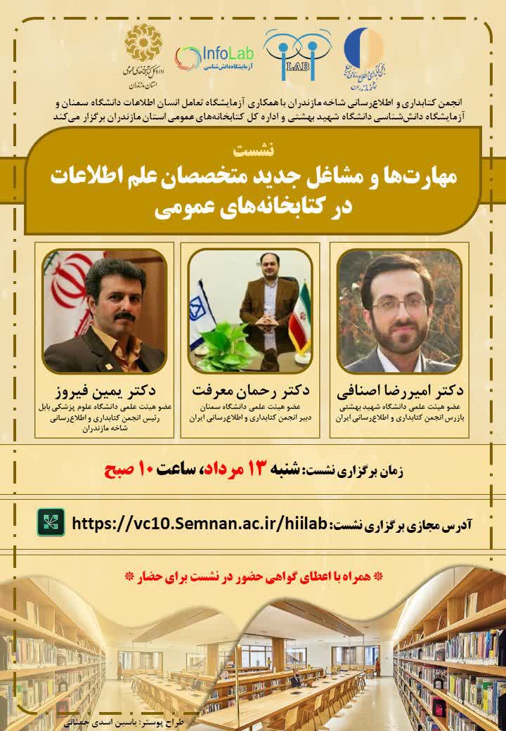انجمن کتابداری و اطلاع رسانی شاخه مازندران با همکاری آزمایشگاه تعامل انسان اطلاعات دانشگاه سمنان و آزمایشگاه دانش شناسی دانشگاه شهید بهشتی و اداره کل کتابخانه های عمومی استان مازندران برگزار میکند: