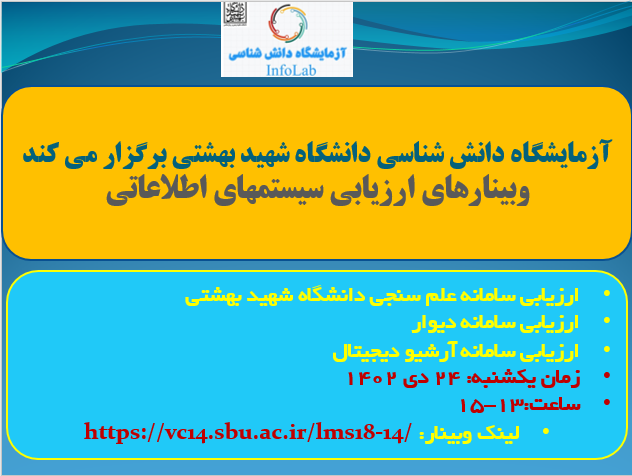 آزمایشگاه دانش شناسی دانشگاه شهید بهشتی، وبینارهای ارزیابی سیستمهای اطلاعاتی را برگزار می کند. عناوین و زمان برگزاری وبینارها به شرح زیر است: ارزیابی سامانه علم سنجی دانشگاه شهید بهشتی ارزیابی سامانه دیوار ارزیابی سامانه آرشیو دیجیتال