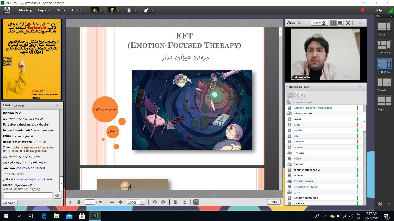 چهارمین وبینار از مجموعه وبینارهای تخصصی گروه مشاوره با عنوان «ورود به دنیای هیجان انگیز درمان هیجانمدار» با سخنرانی آقای مسعود شریف زاده، دانشجوی دکتری تخصصی روانشناسی، مدرس و درمانگر هیجانمدار در تاریخ 9 اسفند ماه 1399 و ساعت ۱۹ الی 30: 20 برگزار شد. در این وبینار که 105 نفر حضور داشتند، شناخت رویکرد هیجان مدار و راهبردهای تخصصی آن مورد بحث قرار گرفت.
