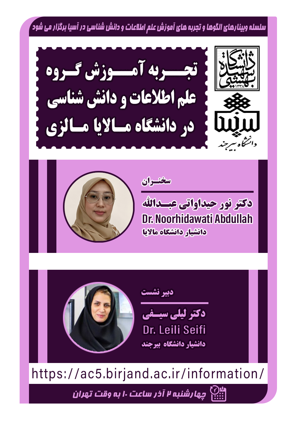 دوره های آموزشی علم اطلاعات و دانش شناسی دانشگاه های بیرجند و شهید بهشتی با ، سلسله وبینارهای الگوها و تجربه های آموزش علم اطلاعات و دانش شناسی در آسیا را برگزار می کنند. چهارمین وبینار با عنوان تجربه آموزش علم اطلاعات و دانش شناسی دانشگاه مالایا کشور مالزی در تاریخ چهارشنبه 2 آذر 1401ساعت 10 صبح به وقت تهران برگزار می شود.