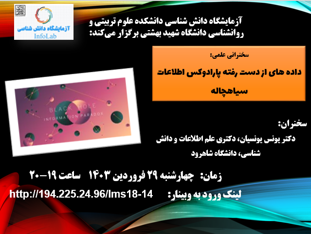 وبینار داده های از دست رفته: پارادوکس اطلاعات سیاهچاله توسط آزمایشگاه دانش شناسی دانشگاه شهید بهشتی برگزار می شود. سخنران این وبینار دکتر یونس یونسیان، پژوهشگر علم اطلاعات و دانش شناسی، کارشناس دانشگاه صنعتی شاهرود خواهد بود. زمان وبینار: چهارشنبه 29 فروردین 1403 ساعت 19-20 است. لینک ورود به وبینار: : http://194.225.24.96/lms18-14