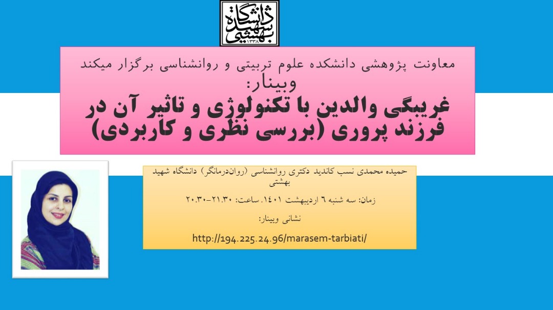 وبینار: غریبگی والدین با تکنولوژی و تاثیر آن در فرزند پروری (بررسی نظری و کاربردی)، سه شنبه 6 اردیبهشت 1401 توسط معاونت پژوهشی دانشکده علوم تربیتی و روانشناسی دانشگاه شهید بهشتی برگزار می شود. سخنران: حمیده محمدی نسب کاندید دکتری روانشناسی (رواندرمانگر) دانشگاه شهید بهشتی