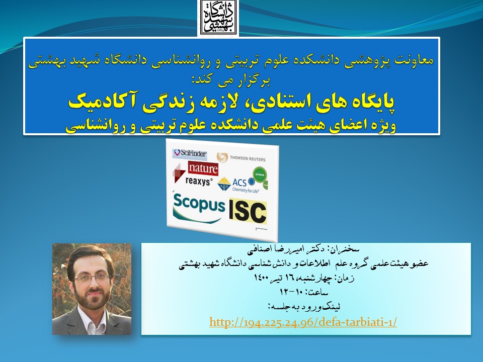 معاونت پژوهشی دانشکده علوم تربیتی و روانشناسی دانشگاه شهید بهشتی، وبینارپایگاه های استنادی، لازمه زندگی آکادمیک را برگزار می کند. زمان: چهارشنبه 16 تیر1400، ساعت 10-12. پیوند شرکت در وبینار: http://194.225.24.96/defa-tarbiati-1/ سخنران: دکتر امیررضا اصنافی، عضو هیئت علمی گروه علم اطلاعات ودانش شناسی