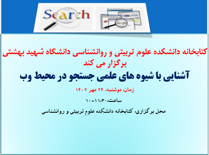 دوشنبه 24 مهر 1402 از ساعت 10-11.30 کارگاه آشنایی با شیوه های جستجو در محیط وب در کتابخانه دانشکده علوم تربیتی و روانشناسی برگزار خواهد شد. علاقه مندان به ویژه دانشجویان تحصیلات تکمیلی می توانند در این کارگاه به صورت رایگان شرکت کنند.
