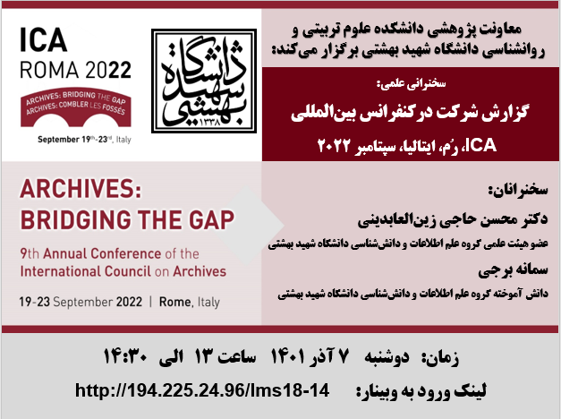 به مناسبت هفته پژوهش، معاونت پژوهشی دانشکده علوم تربیتی و روانشناسی دانشگاه شهید بهشتی، گزارش سفر علمی شرکت در کنفرانس ایکا 2022 را برگزار می کند. در این جلسه، دکتر محسن حاجی زین العابدینی عضو هیئت علمی گروه علم اطلاعات و دانش شناسی دانشگاه شهید بهشتی و سمانه برجی دانش آموخته کارشناسی ارشد این گروه تجربیات و یافته های خود را از حضور در کنفرانس سالانه ایکا 2022 که در شهر رم ایتالیا برگزار شد مطرح می کنند.